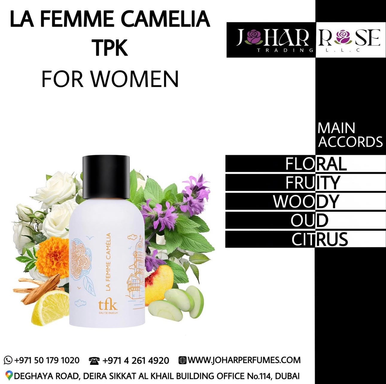 LA FEMME CAMELIA is a delicate and elegant fragrance that embodies femininity and grace. It opens with soft, fresh floral top notes that immediately uplift the senses, followed by a heart of camellia and subtle powdery undertones, adding warmth and sophistication. The base is composed of smooth musks and gentle woody notes, leaving a long-lasting, graceful trail. LA FEMME CAMELIA is perfect for those who desire a refined, romantic scent that exudes elegance, charm, and timeless femininity.