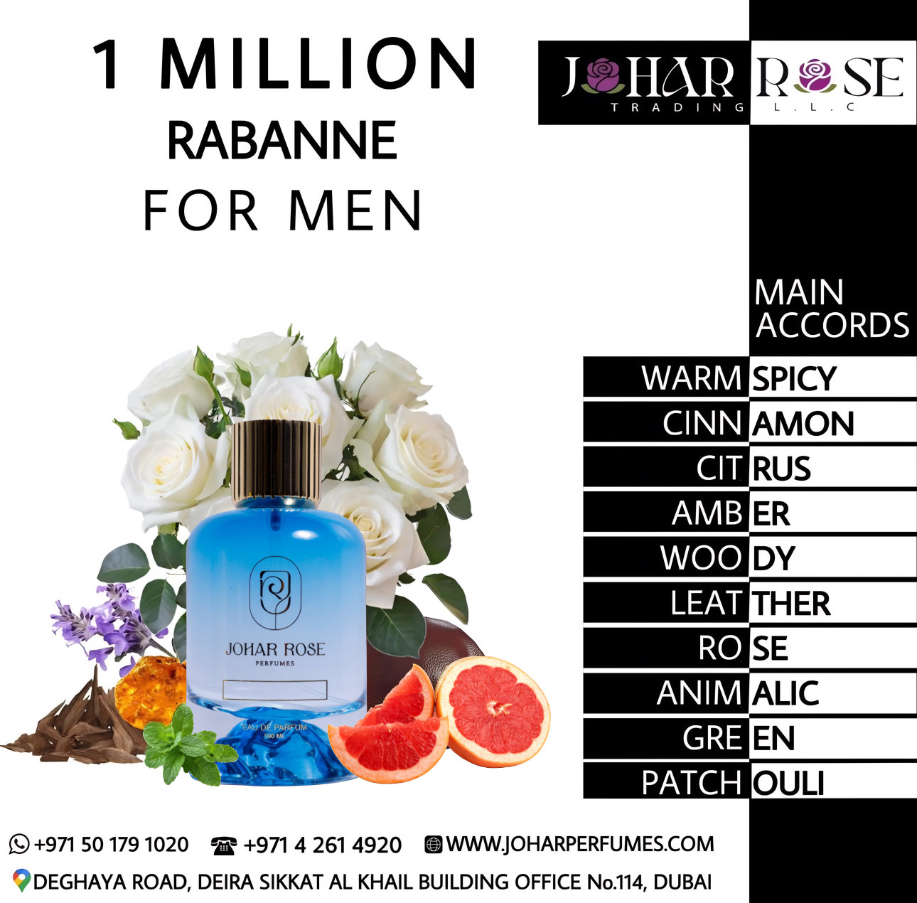 1 Million is a bold, vibrant, and luxurious fragrance that exudes confidence and power. It opens with sparkling, fresh notes of citrus and grapefruit, immediately creating an energetic and striking impression, followed by a heart of spicy, warm notes that add depth and intensity. As it settles, the scent reveals a rich, sensual base of leather, amber, and woody accords, leaving a long-lasting, magnetic trail. Glamorous, daring, and unmistakably charismatic, 1 Million is perfect for those who make a statement wherever they go.