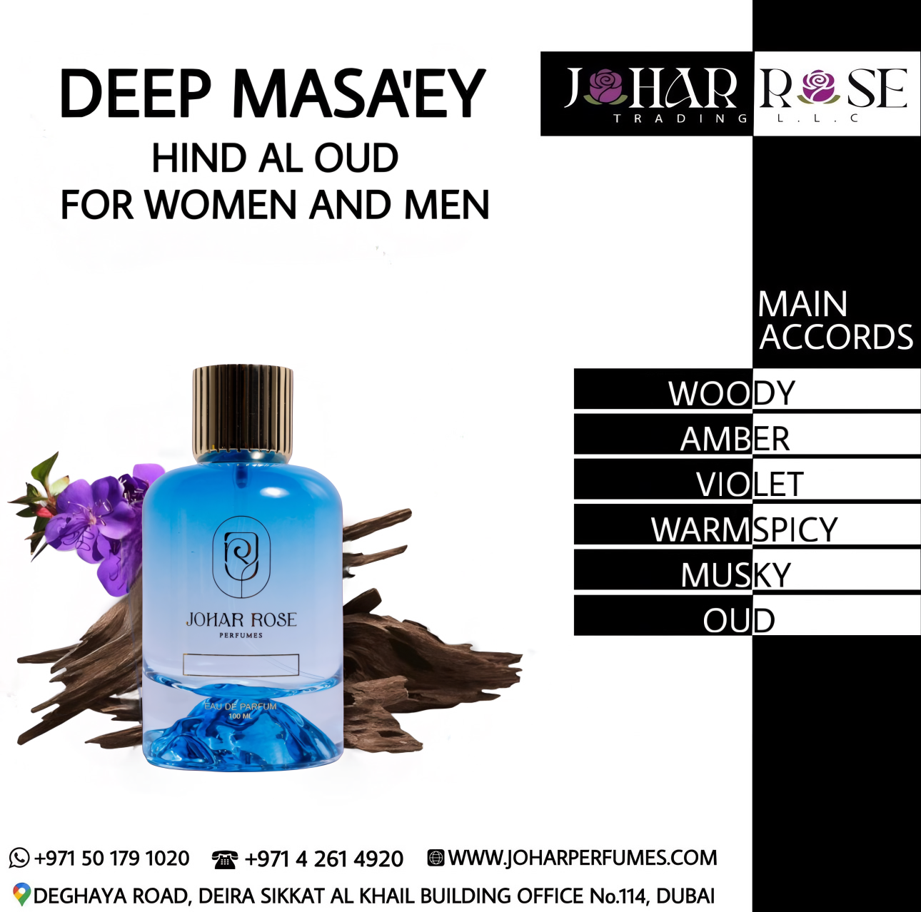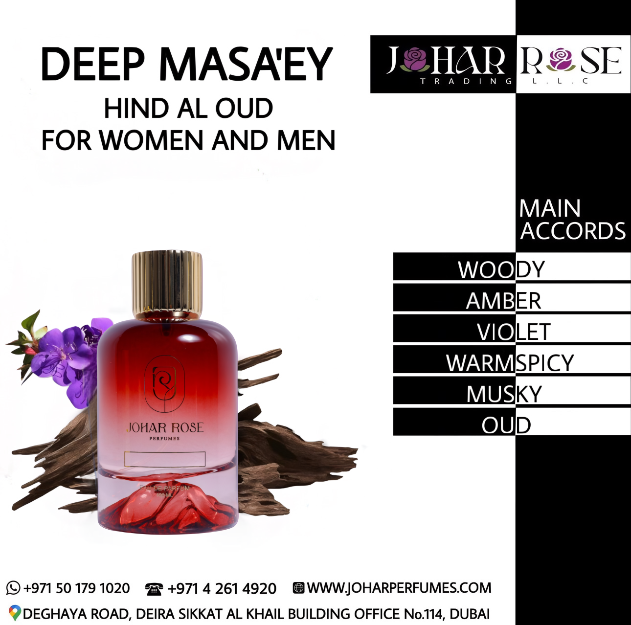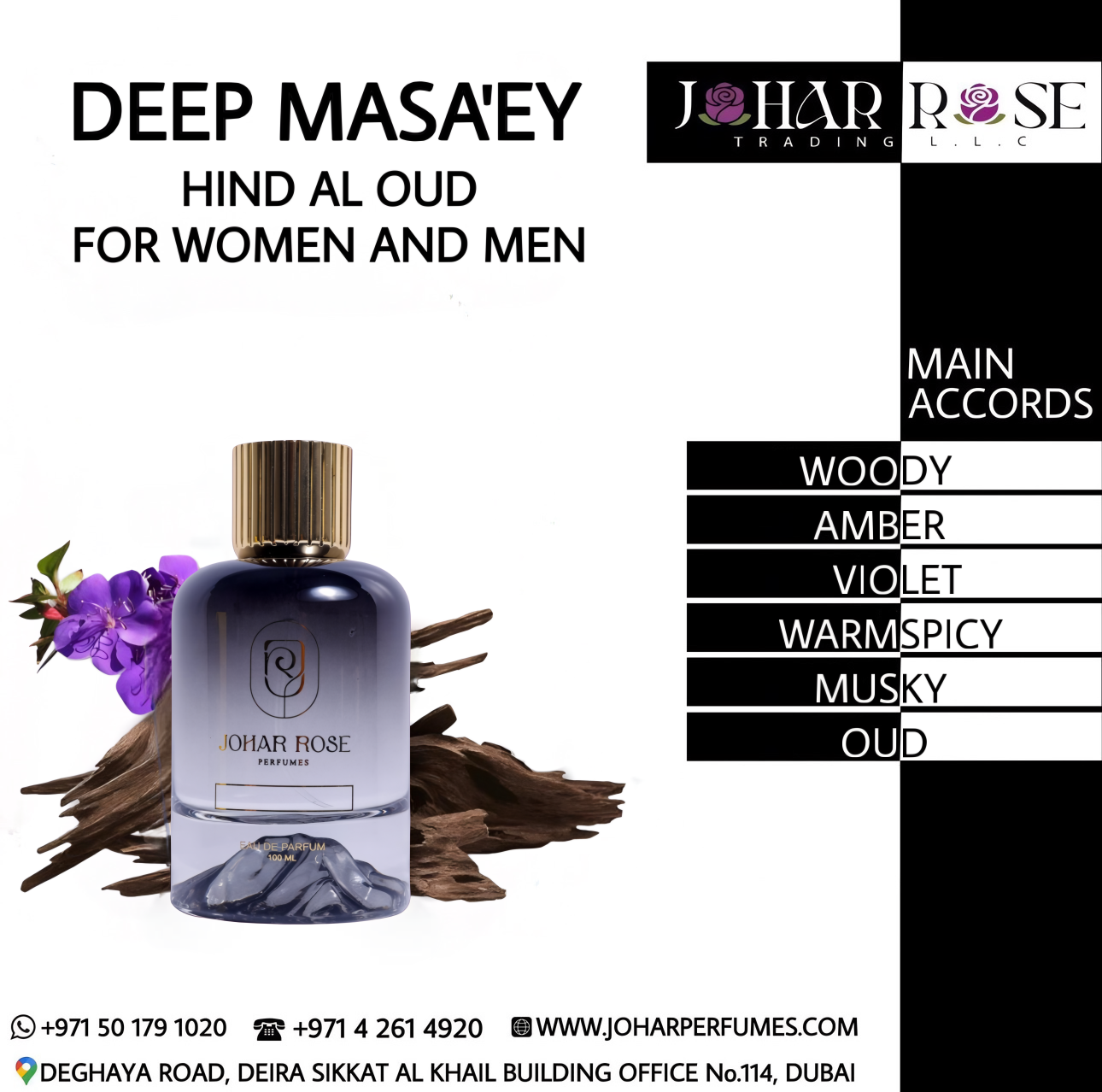 Deep Masaey is a rich, captivating fragrance that blends warmth and depth with modern elegance. It opens with vibrant, aromatic top notes that immediately engage the senses, followed by a heart of smooth spices and subtle florals that add complexity and intrigue. As it settles, the scent develops into a deep, woody base with hints of amber and musk, leaving a long-lasting, sophisticated trail. Bold, refined, and irresistibly magnetic, Deep Masaey is designed for those who appreciate a commanding and elegant presence.