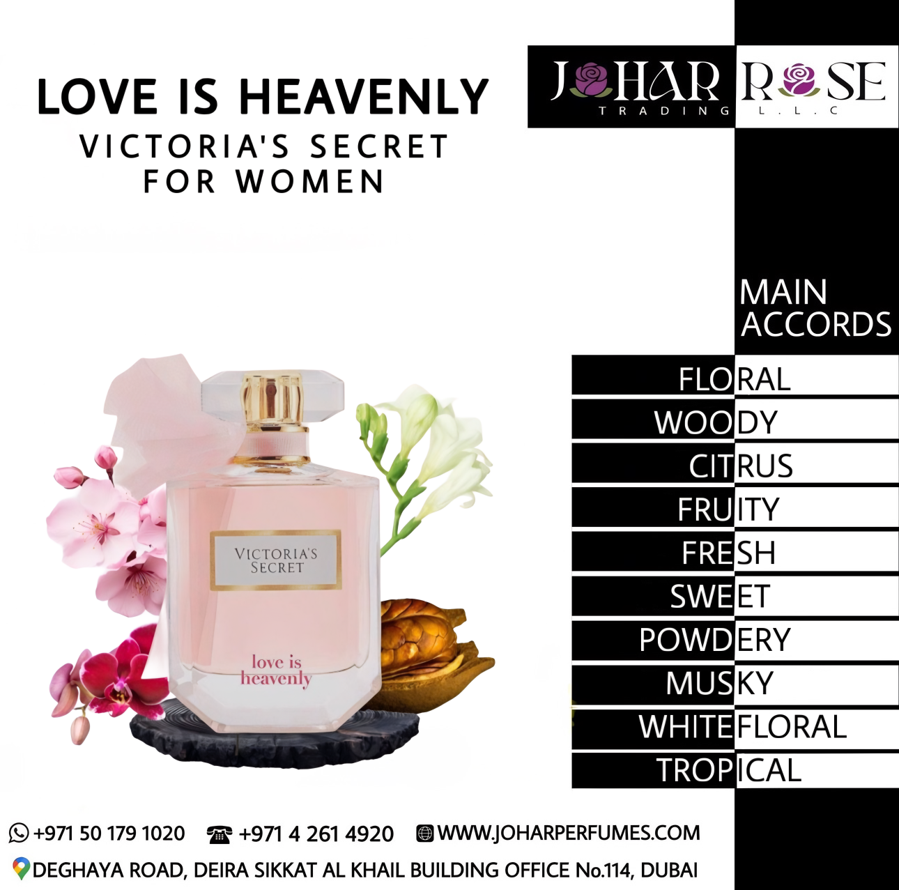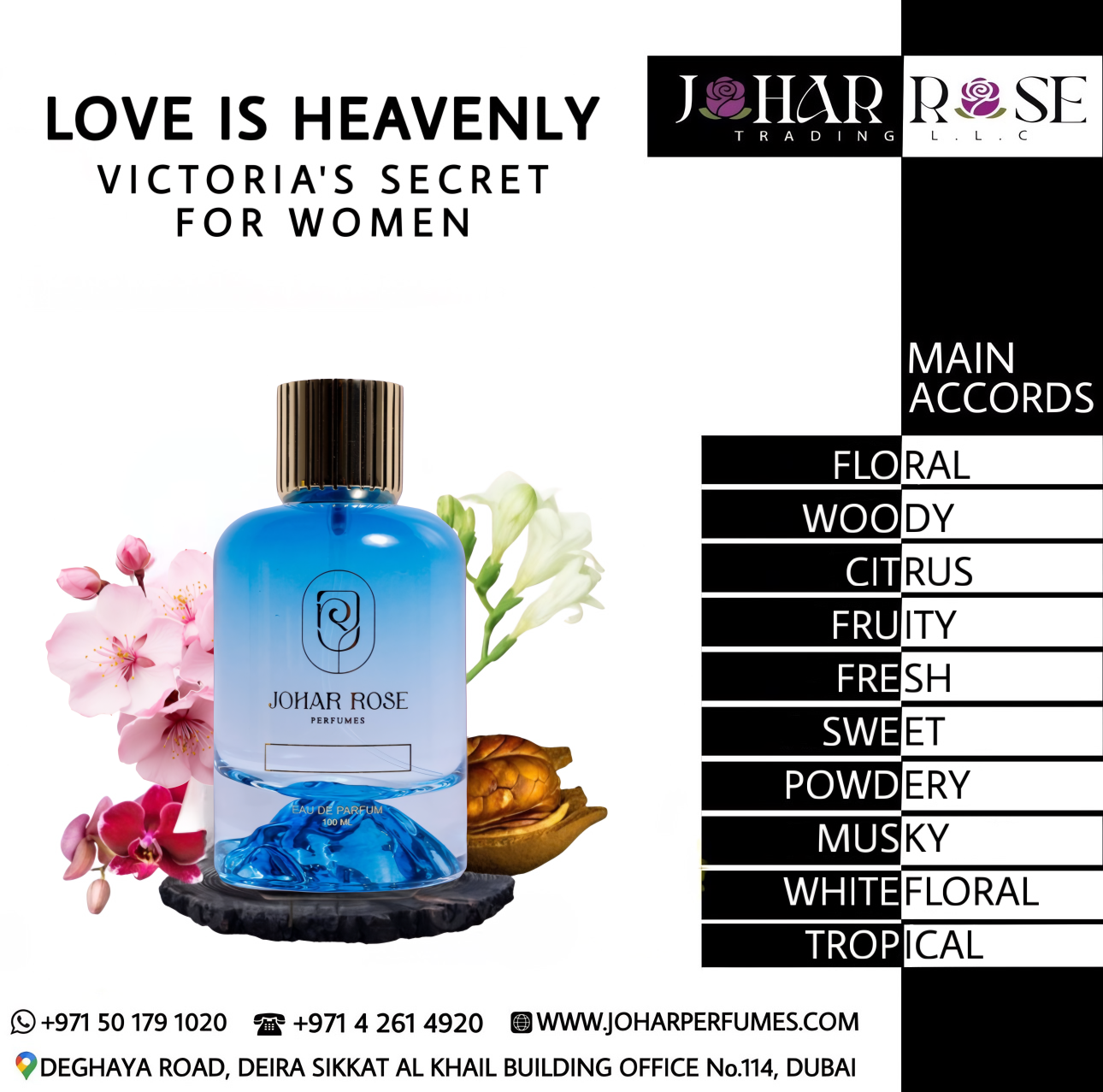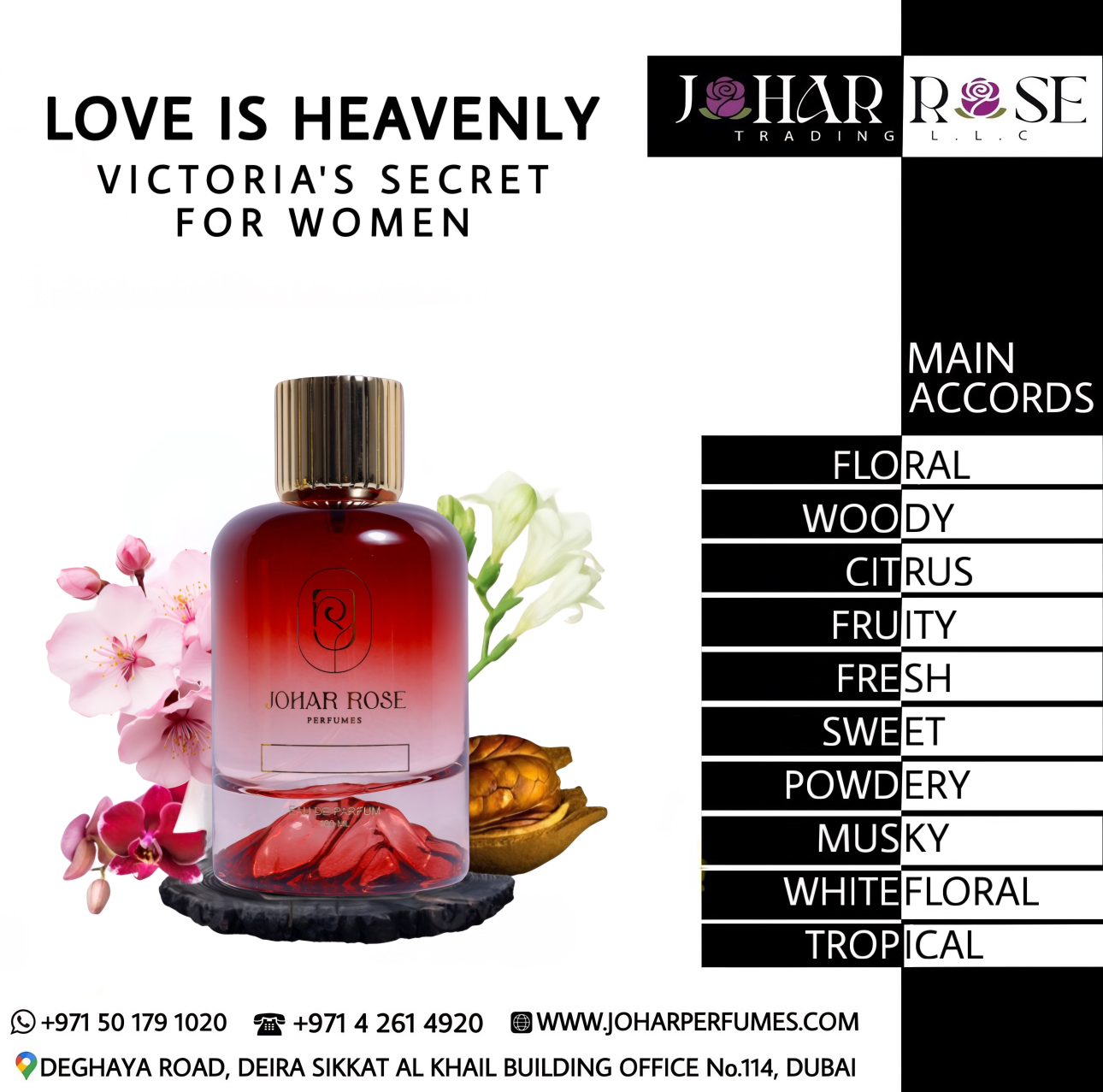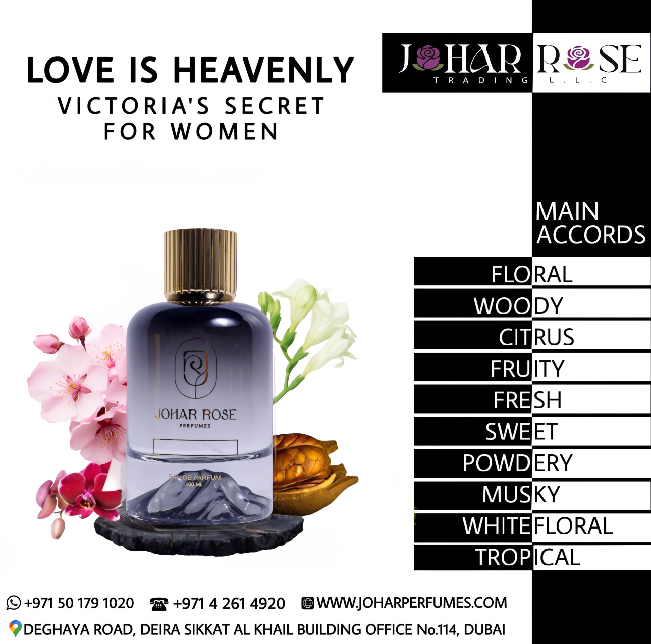 LOVE IS HEAVENLY is a soft and romantic fragrance that exudes elegance and warmth. It opens with gentle, fresh floral notes that immediately create a light and uplifting impression, followed by a heart of delicate fruits and subtle powdery undertones, adding depth and charm. The base is anchored by smooth musks and warm woods, leaving a long-lasting, comforting trail. LOVE IS HEAVENLY is perfect for those who seek a tender, sophisticated scent that embodies romance, grace, and timeless femininity.
