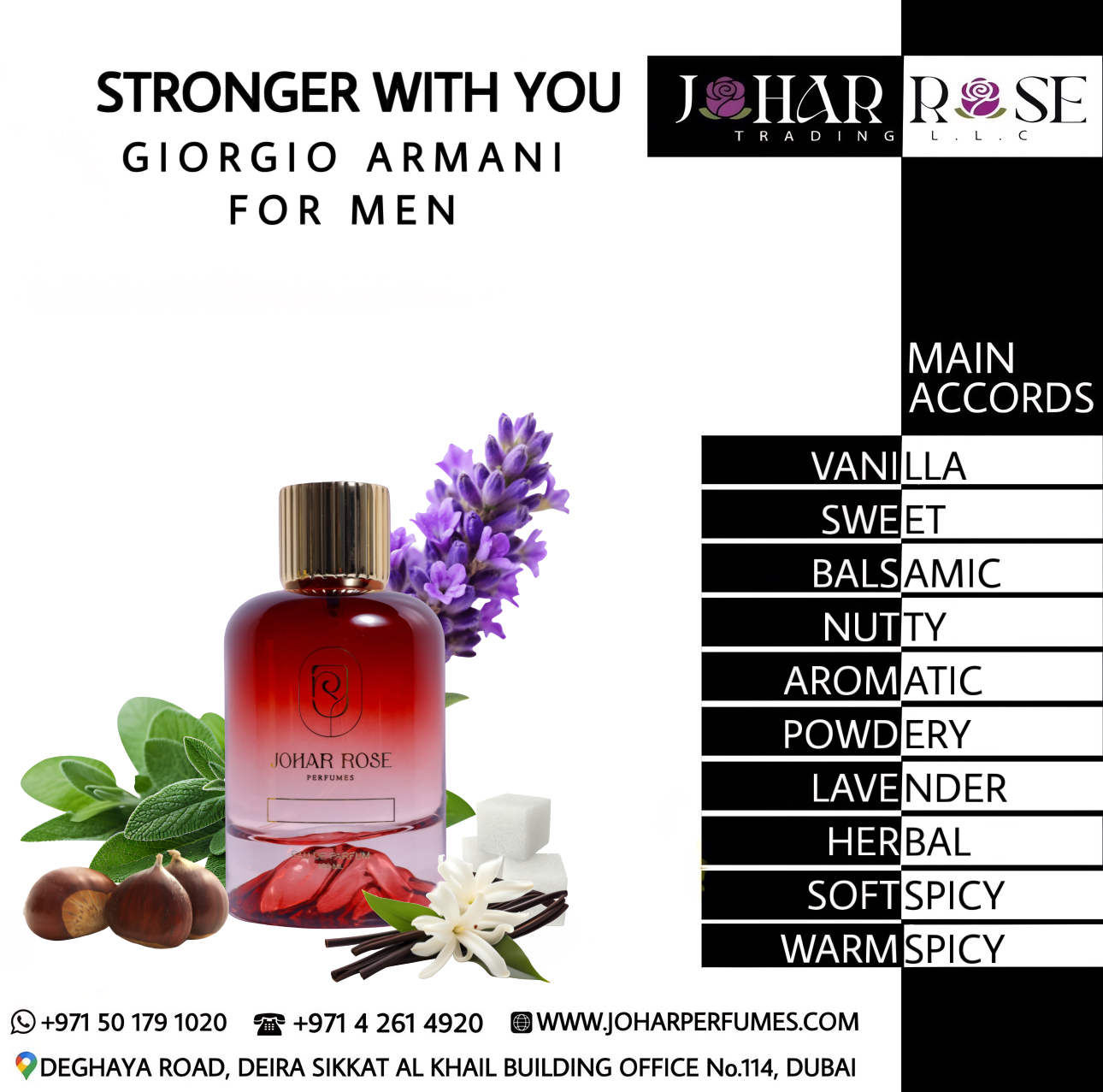 STRONGER WITH YOU is a warm and captivating fragrance that exudes charm and confidence. It opens with fresh, sweet top notes that immediately uplift the senses, followed by a heart of aromatic spices and subtle floral undertones, adding depth and sophistication. The base is anchored by smooth musks, warm woods, and soft vanilla, leaving a long-lasting, inviting trail. STRONGER WITH YOU is perfect for those who seek a modern, romantic scent that embodies strength, warmth, and timeless elegance.